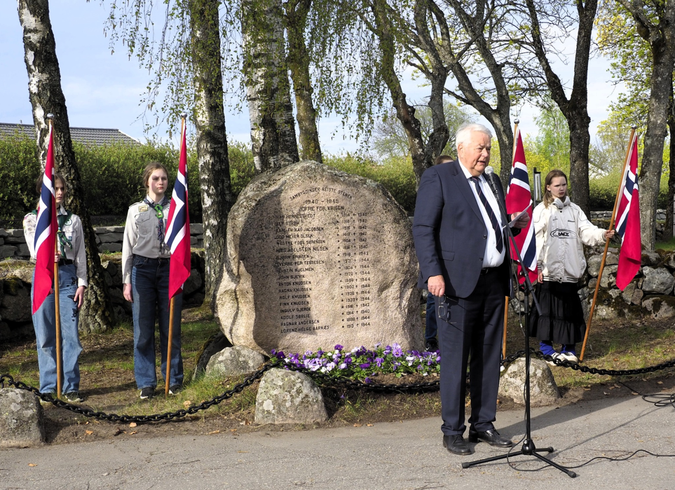 Fra feiringen av frigjøringsdagen og veterandagen 8. mai ved minnesteinen i Ski. Under ledelse av Knut Falla i Nordre Follo og omegn Forsvarsforening. 1. Ski holdt flaggborg, taler ved Cecilie Dahl-Jørgensen Pind - Ordfører i Nordre Follo, Tine på Tinget (Stortingsrepresentant Anne Kristine Linnestad) og Finstad Gladbrass spilte. Det var ca 50 frammøtte.