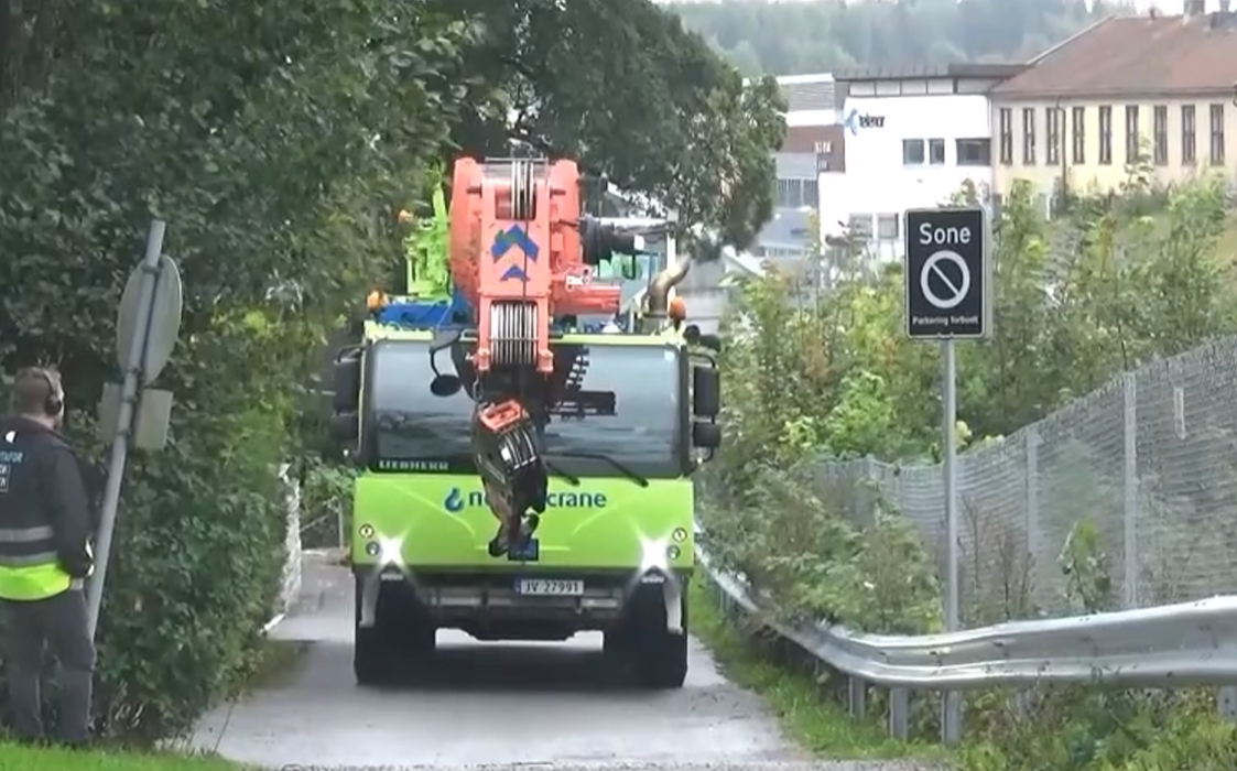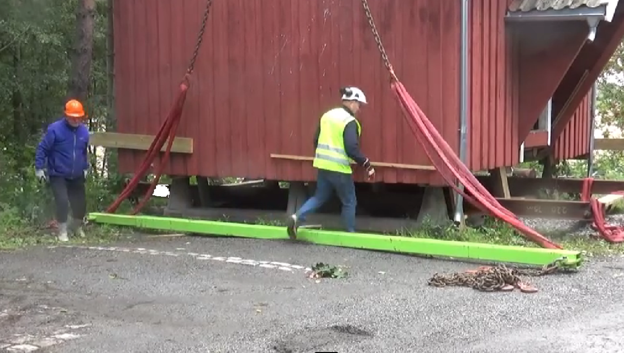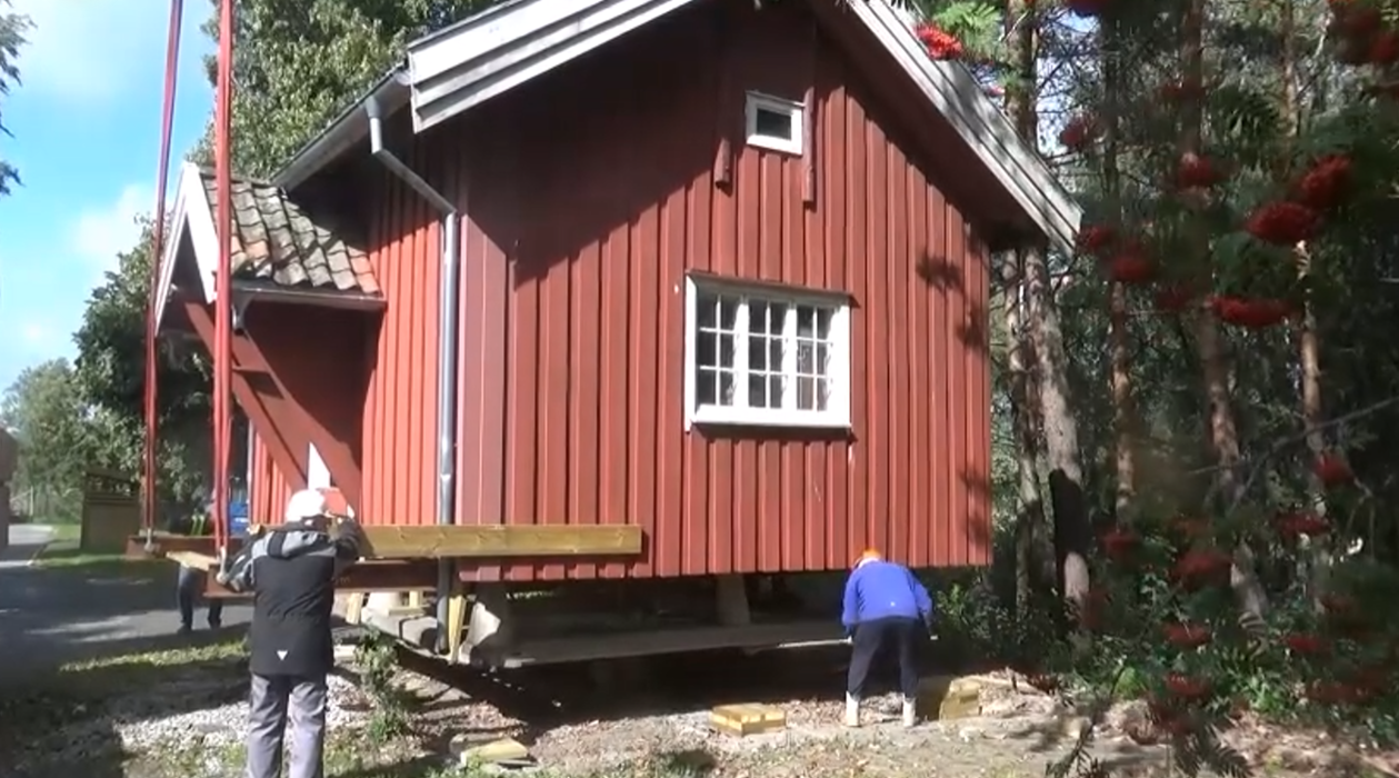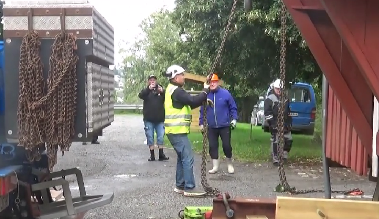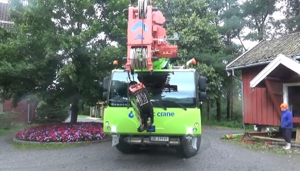 Stabburet er nå rettet opp. At man ikke klarte det mandag 19. august, skyldtes at krana ikke klarte løftet. I dag kom en kran fra Drammen (krana kjører 89/90 km i timen på landevei), og som kunne løfte 90 tonn - det måtte et løft på 20 tonn for å få gjort jobben. Vedlagt er noen bilder tatt av Grunde Vale og Christian Olsen fra jobben som ble gjort i dag mandag 26. august.