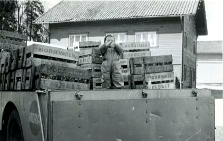 Bildet viser foredragsholderen som tester varene fra Nora i 1958. I bakgrunnen ser vi forretningen til Elise Brække. Foto Pål Levin.