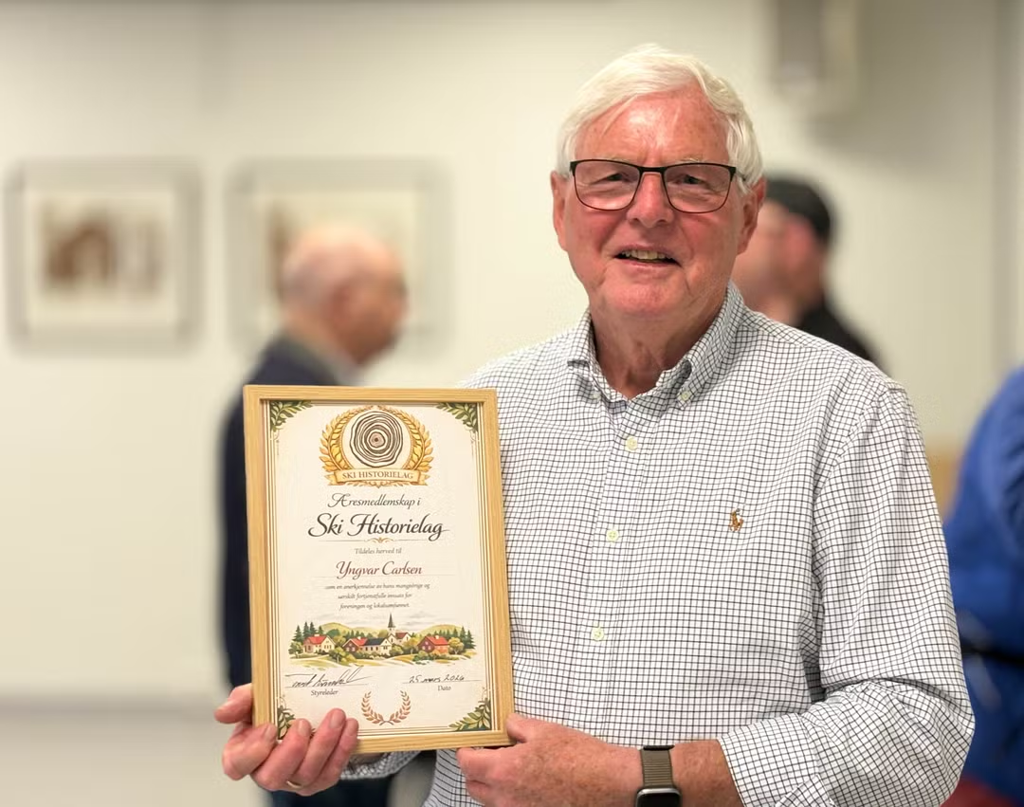 Les ØBs omtale av da Yngvar Carlsen, mangeårig styremedlem og kasserer i Ski Historielag fikk overrakt diplomet som bevis på utnevnelse til æresmedlem i historielaget. Yngvar ble utnevnt på årsmøtet i april, men da var han sykmeldt. Han sier det til tider har vært slitsomt med styrejobben, men jeg tror han har likt det jeg. Foto: Stig Erlend Persson.