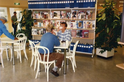 Åpningstidene i det nye biblioteket var mandager, tirsdager og torsdager kl. 14-20, onsdager og fredager kl. 12-16, og lørdager kl. 10-14. Bildet viser biblioteket i Idrettsveien 20, ca. 1990. Lokalene var lyse og innbydende og lå på gateplan. Biblioteket holdt til her i perioden 1987 - 1993. Fotograf: Ski bibliotek.