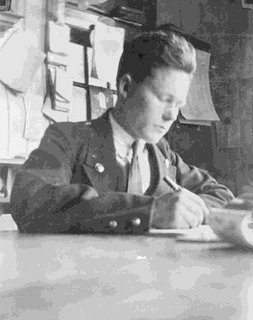 De var også opptatt av smitte den gangen for 95 år siden. I §12 kan vi lese at det ikke tillates å låne ut bøker til personer eller hjem med smittsom sykdom. Skulle det oppstå smittsom sykdom i et hjem, måtte bøkene returneres snarest og deretter desinfiseres hvis det var mulig. Bildet viser Øivind Schjønberg i arbeid på Ski stasjon. Øivind Schjønberg (1902-1942) ble den første lønnede ansatte ved folkebok samlingen i 1929. Han satt for øvrig i bibliotekstyret og hadde hatt jobben på fri villig basis siden 1927 (sammen med andre medlemmer av styret). Schjønberg var ut dannet telegrafist og jobbet på Ski stasjon. Fotograf: ukjent.