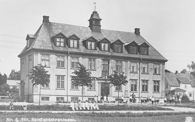 Like før jul i 1906 overdro Siggerud ungdomslag sin boksamling på 60 bind til kommunen. Disse bøkene skulle utgjøre grunnstammen i en folkeboksamling på Siggerud. I Kråkstad var Kråkstad frisinnede ungdomslag i gang med noe tilsvarende omtrent på samme tid. De hadde opprettet boksamlingen sin i 1902. De første årene var imidlertid utvalget magert og forbeholdt lagets medlemmer. I 1907 ble boksamlingen overdratt til Kråkstad kommune og Kråkstad folkeboksamling så dagens lys. Bildet viser Samfundsbygningen, 1934. Ski Folkeboksamling åpnet dørene for publikum her i 1922. Den første tiden holdt de til i et rom på loftet. I 1927 fikk de benytte et ledig klasserom i 1. etasje. Etter planen skal biblioteket flytte tilbake til dette området. Nytt bygg med bibliotek, kulturskole og videregående skole skal reises omtrent der det hvite huset til høyre på dette bildet står. Fotograf: ukjent.