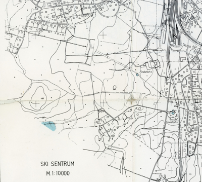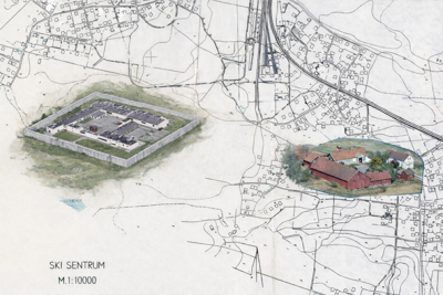 Justisdepartementet foretok våren 1959 undersøkelser for å finne en passende tomt til et nytt landsfengsel på Østlandet. Det ble søkt innenfor et område på inntil 30 km fra Oslo, med særlig vekt på god jernbane- og veiforbindelse. Etter befaringer blant annet i Bærum, Asker, Lillestrøm, Fet og Ski, konkluderte departementet med at et skogområde på ca. 200 mål på gården Nordre Finstad i Ski var best egnet. I St.prp. nr. 1 for 1959–60 ble det foreslått å kjøpe området, og en bevilgning på kr 800 000 for dette formålet ble ført opp i budsjettet. Bildet viser et kartutsnitt fra et kart over Ski sentrum i 1963.