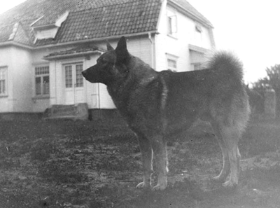 En så flott hund var selvsagt populær i avlssammenheng og Skrubb ble stamfar til riktig mange etterkommere. På Norsk Kennel klubbs utstilling i juni 1933 var hele 15 av de totalt 70 påmeldte hundene i klassen for ‘grå dyrehunder,’ etterkommere etter Skrubb. Bildet viser elghunden Skrubb. Bildet er tatt på nordsida av familien Hemsens hus, Glitre, ved Kirkeveien. Fotograf: ukjent.