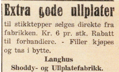 I Ostlandet Blads utgave 6. september 1939 kunne en blant annet lese følgende, sitat følger: Ved den nye Vevelstadveien har veifarende i det senere kunnet legge merke til at man har holdt på med opførelse av en fabrikkbygning. Nu er bygningen ferdig, maskinene er installert og fabrikkasjonen begynt. Fabrikkens navn er Langhus Shoddy- og Ullplatefabrikk og navnet sier jo nesten selv hva dens fabrikata skal bli.