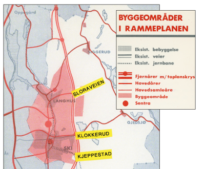 Langhusveien og Oppegardveien, på ca. 700 dekar av gardene Endsjø og Roas. Jernbanen skulle med en viss omlegging innarbeides i en endelig sentrumsplan. Bildet viser boligområder og ferdselsårer i Ski Generalplan 1968. Planen var basert på hovedtrekkene i rådmann Rønnebergs innstilling til Andersson og Skjånes plan om en Ski-byen.