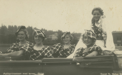 Om prinsessen skrev Østlandets Blad (6/7-1936): ”Prinsessen er født 16.august 1917 og er altså blottende ung, bare 19 år. Prinsessen var i en vakker hvit silkekjole med hvit cape, foret med rød silke. På hodet et smykke med kongelig diadem, i favnen en stor bukett med roser og i tillegg fikk hun også et bredt sølvarmbånd med initialer til tegn på sin kongelige verdighet.” Festen holdt på til langt på natt og brakte et pent overskudd i klubbkassen og ble gjentatt i 1937 og 1938. Den siste gangen oppstod imidlertid en del vansker med avviklingen av arrangementet og klubben la derfor videre prinsesse kåringer på is. Bildet viser Folloprinsessen med terner, 1936. Bakerst sitter prinsessen, Rannveig Braathe. De fire ternene er Gerd Haug, Gerd Linnestad, Mary Heie og Gudrun ”Lilleba” Jakobsen. Vi vet ikke hvem som er hvem av disse. Fotograf: Thorstein Nielsen.