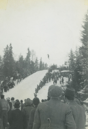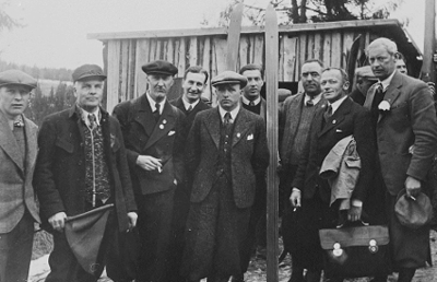 Nå ble imidlertid ikke navnet Resolut, men Skimt. Navneforslaget kom fra klubbens første formann, Thorleif Hemsen, og ble vedtatt på generalforsamlingen 30.oktober 1915. I protokollen kan en for øvrig lese at oppslutningen om møtet var laber. Foruten styret var det bare et par medlemmer til stede. Bildet viser hoppdommerne er på plass, 1936. Bildet er tatt i forkant av Skimts vårhopprenn, palmesøndag 1936. Til venstre ser vi Gunnar Gundersen og Thorleif Hemsen (med flagg). Rolf Skonnord står i bakgrunnen med hoppski. De to lengst til høyre er Karl Pedersen ”Calle P.” (med veske) og Jacob Kleveland. De øvrige er ikke identifiserte. Fotograf: ukjent.